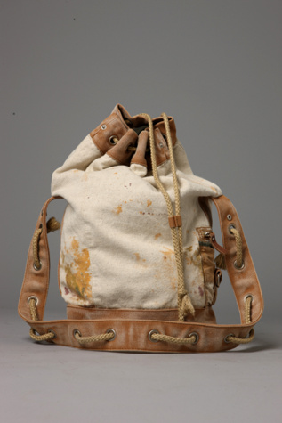 Two tone canvas bag highlighed with splashes of paint in various colors. Exterior cargo pocket with zip closure adorned with a smaller snap tab pocket. Thick shoulder strap with grommets and braided drawstring for cinching. Interior pocket and drawsting closure