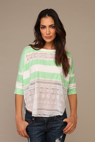 Striped knit loose fit top with batwing sleeves. Sheer lace insets on the front and bottom hem.